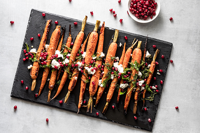 Roasted carrots topped with cheese, herbs and pomegranate arils are a creative Thanksgiving side. Photo: Deposit Photos