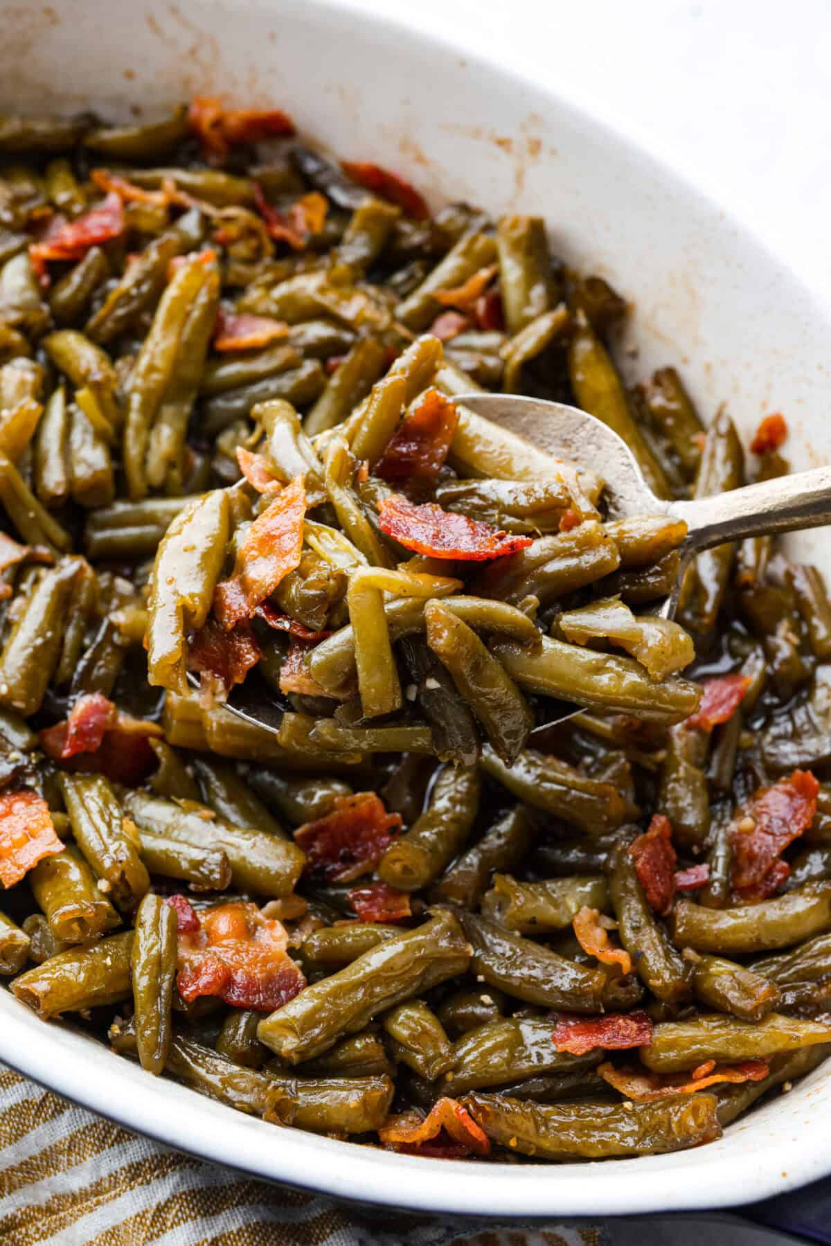Crack green beans are the side dish that guarantees seconds! Tender green beans bake in a sweet-savory buttery sauce with smoky bacon. These are simple to make, wildly addictive, and gone in minutes.