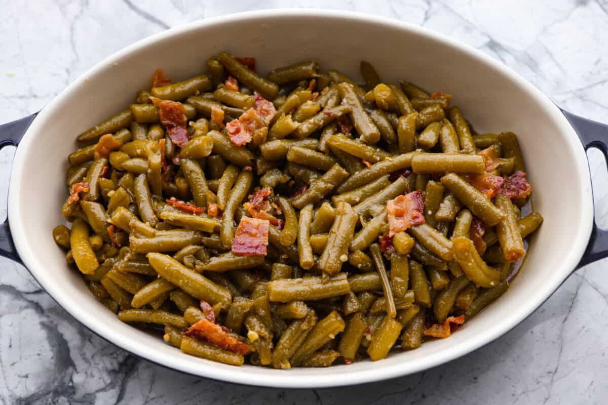 - Toss and Bake: Add the green beans and cooked bacon to the sauce and toss to combine. Transfer the coated green beans to the prepared baking dish. Bake for 25-30 minutes, stirring occasionally to coat the beans. Cook until the green beans are tender and soft.